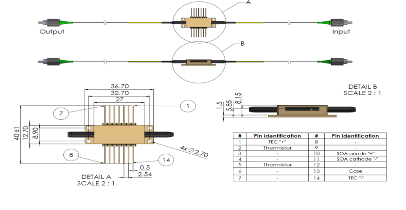 中心波长:1300nm;饱和输出功率@-3dB:22dBm;带宽@-3dB:60nm;偏振消光比:16dB;小信号增益@Pin=-20dBm:28dB,光纤类型:HI1060或PM980(PM1300),接头类型:FC/APC;需要套管请备注