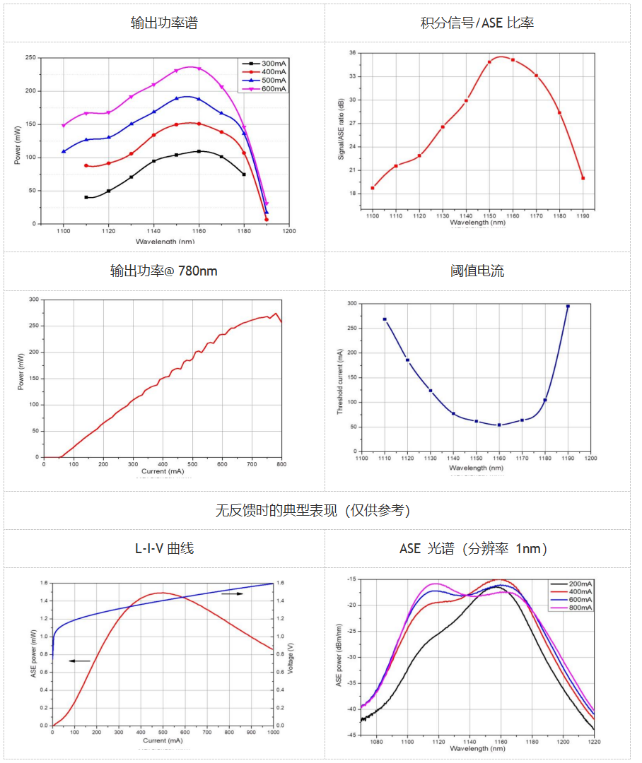波长(最大功率处):1160nm; 中心波长:1150nm; 调谐范围:90nm; 最大输出功率:230mW; 正向电流:600mA; 慢轴光束发散角:5deg; 快轴光束发散角:42deg;