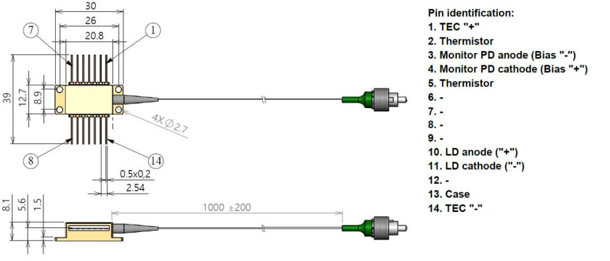 SLD1000100HI015MXXXX -> 输出功率为 15mW,平均波长为 1000nm,带宽为 100nm,HI-1060 光纤 SLD1000100HI015MFXXX -> 输出功率为 15mW,平均波长为 1000nm,带宽为 100nm,HI-1060 光纤,内置监控光电二极管