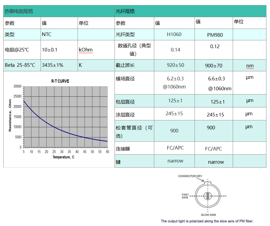 中心波长:1060nm;带宽:8-15nm;偏振消光比(PM)>21dB;输出光功率:250mW;光纤类型:HI1060或PM980;接头类型:FC/APC;尾纤默认裸纤,如需套管请备注