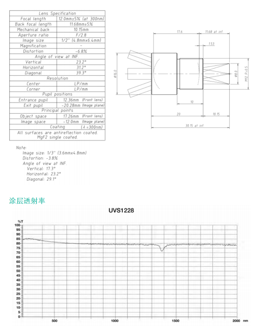 UVS1228;焦距:12.0mm;F/No.:2.8,传感器尺寸:1/1.8";接口:M12 S-Mount;光圈控制:固定的;镜头应用:紫外线;尺寸:16mm*20mm