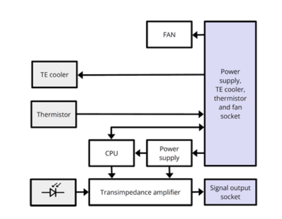 LabM-I-4是一种检测模块,其特征是基于HgCdTe异质结构(PVI-2TE-4-1×1-TO8-wAl2O3-36)的TE冷却、光学浸没光伏红外探测器,与可编程跨阻抗放大器(PIP系列)集成。
