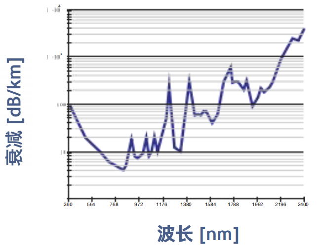 ● 相比硬包层的石英光纤, 紫外波长和红外波长传输性更好