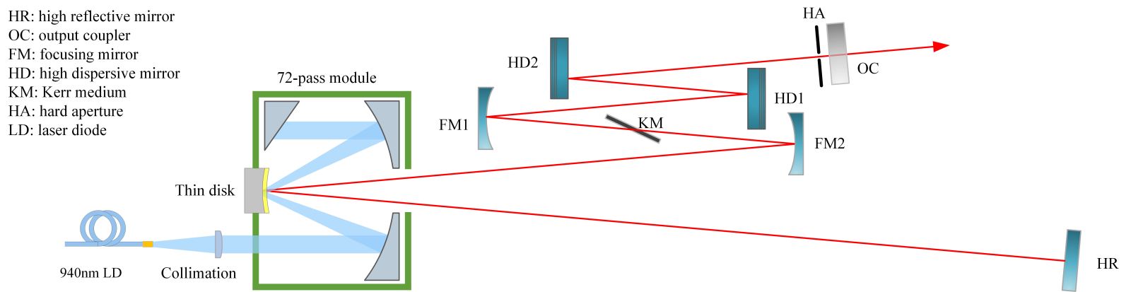 研究团队首先基于克尔透镜锁模的原理和ABCD 矩阵的迭代计算,进行了薄片克尔透镜锁模激光器锁模理论分析,模拟了锁模运转与连续运转时谐振腔内模式的变化,确认锁模后硬光阑处的腔内模式半径将减少7%以上。
