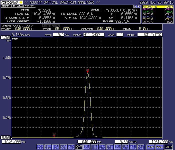 我们304永利集团采用1.95um的激光器作为种子源,用1.6um的激光器作为泵浦放大,泵浦功率要大一些,我们使用了L波段的EDFA放大器对1.6um的光进行放大。再把种子激光跟泵浦光通过波分复用器耦合在一起,输入到一段2米长2um的掺铥光纤中,经过光纤吸收后,传输到2um的耦合器中,一分为二,把测量的谱在中红外横河AQ6377光谱仪上观察波形。之后再利用Bristol 波长计观察做出来的TDFA放大器自发辐射的光谱。