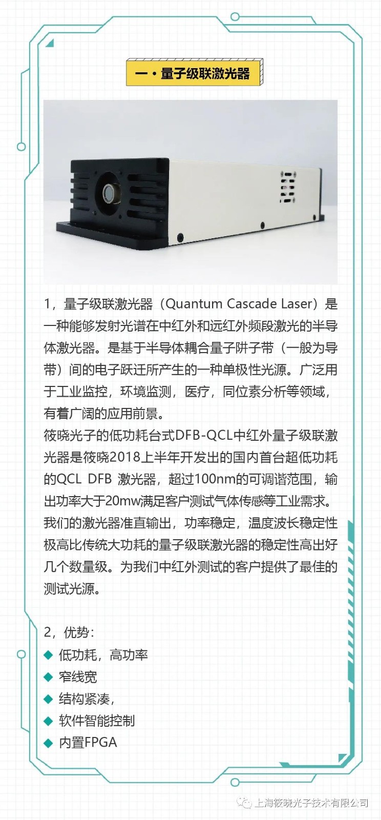 1,量子级联激光器(Quantum Cascade Laser)是一种能够发射光谱在中红外和远红外频段激光的半导体激光器。是基于半导体耦合量子阱子带《一般为导带)间的电子跃迁所产生的一种单极性光源。广泛用于工业监控,环境监测,医疗,同位素分析等领域有着广阔的应用前景。