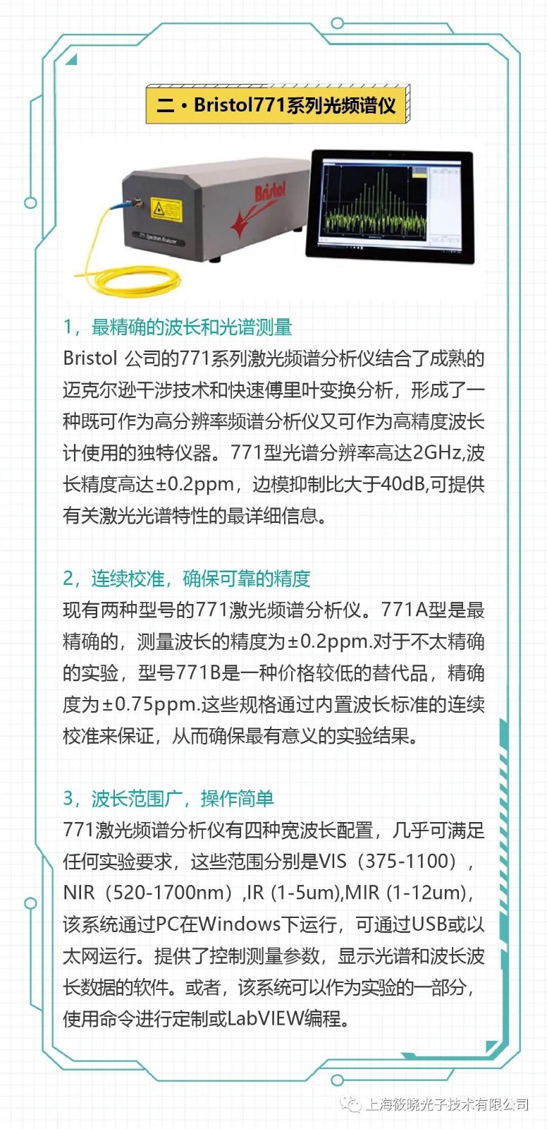 Bristol公司的771系列激光频谱分析仪结合了成熟的迈克尔逊干涉技术和快速傅里叶变换分析,形成了一种既可作为高分辨率频谱分析仪又可作为高精度波长计使用的独特仪器。771型光谱分辨率高达2GHz,波长精度高达+0.2ppm,边模抑制比大于40dB,可提供有关激光光谱特性的极为详细信息。