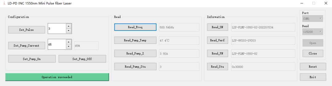这款1550nm小型脉冲激光器用软件控制泵浦光的功率和激光的脉宽。另外,需要接入外部电压信号,用外部电信号作为触发信号(边沿触发),来控制脉冲的输出。激光器有两根光纤跳线作为输出,一根是主输出端,峰值功率可达2~3KW,另一端是参考光,功率在uW级别,是种子光的成分,可以用于观测种子光的各种参数。