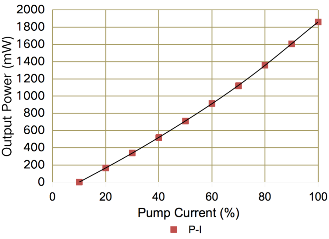通过调节泵浦光功率,可以控制脉冲激光器的平均输出功率在0W~1.9W连续变化,如下图所示(3ns脉宽,500kHz重复频率下):
