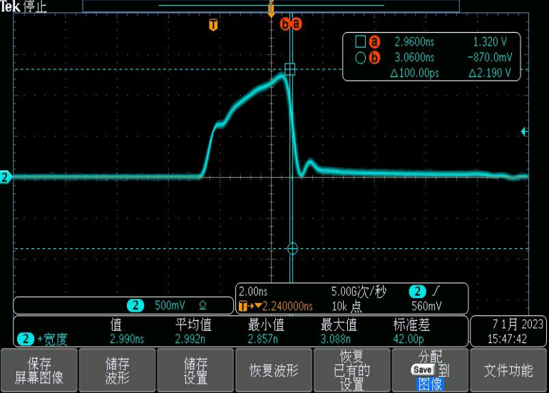 使用超快光电探测器,对脉冲的光功率进行直接探测,探测得到的光功率时域图就呈现了光脉冲的波形,我们可以观察到脉宽为3ns,脉宽的抖动为100ps。