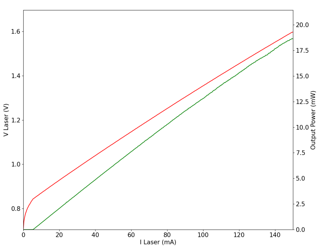 举个我们最熟悉的例子,半导体激光器电流调制。以下是我们公司的一款DFB激光二极管的功率-电流曲线图(绿色曲线)。