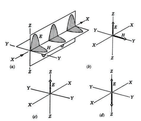 图 1.沿 X 方向传播的光在 YZ 平面中发生偏振。 “E”是电矢量,在该图中,它平行于 Z 平面。 “H”是磁矢量,它平行于Y平面。