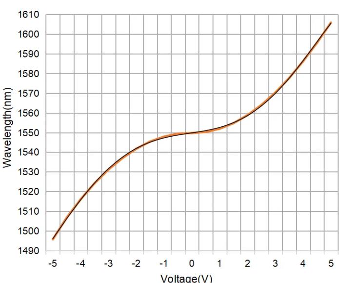 我们对可调滤波器的输入电压进行定标,得到该产品的波长电压调谐曲线(C波段滤波器),同时测量了正负电压、无外加电压时的光谱图,输入光为宽谱光源,在不同波段的信噪比会有所不同。
