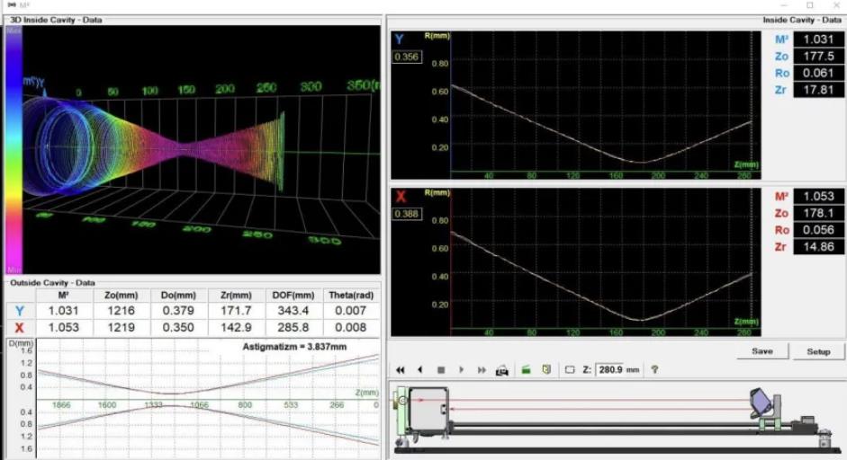 让光束通过无相差透镜,光束会汇聚在大约透镜焦距位置处,对成像方的光路进行切片式测量,得出透镜后激光光路的相关参数,结合透镜变化公式便可得出光束真实的参数信息。