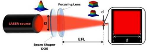 3) 灵活性。得益于微纳加工技术的长足发展,DOE可以针对不同的激光器或不同的目标光强/位相分布进行订制。同时,DOE应用的光路结构非常简单,在使用中搭配不同的透镜,可实现不同几何尺寸的光斑。