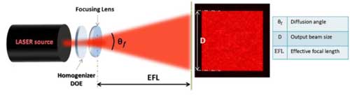 光束匀化器通常以“漫射角(diffusion angle)”来表征准直光束经过器件后的发散能力。可以选配不同焦距的透镜来实现不同的投射面积。