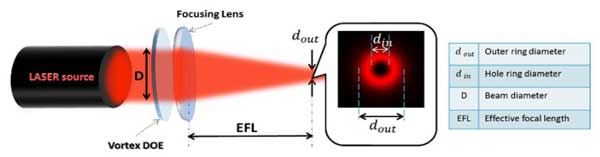 锥透镜被广泛用于激光加工中产生贝塞尔光束,以实现较大的焦深。在锥透镜上加以衍射光学技术,可将准直光变换为圆锥面上传输。经过透镜成像,可以实现环形光斑。如用于点光源,可形成沿轴向分布的焦线。