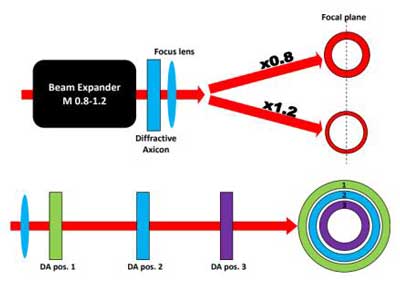 对光束直径、衍射锥透镜的位置加以调整,可实现不同的直径以及不同的粗细的环: