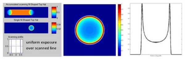 图10:M型光束线扫描强度分布(左)及光斑形貌(右)