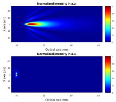 图15 高斯光束(下)与贝塞尔光束(上)经过相同透镜后的焦斑轴向分布