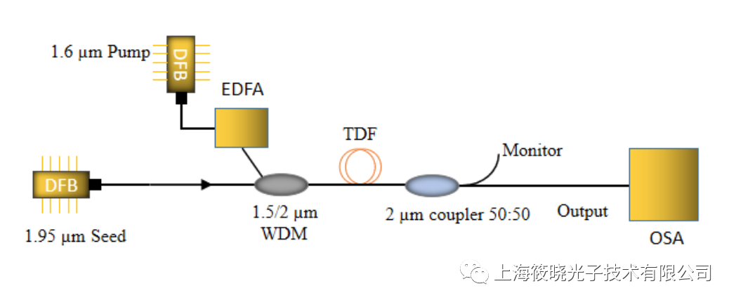 我们304永利集团采用1.95um的激光器作为种子源,用1.6um的激光器作为泵浦放大,由于激光器本身输出功率不够大,我们使用了L波段的EDFA放大器对1.6um的光进行放大。再把种子激光跟泵浦光通过波分复用器耦合在一起,输入到2um的一段掺铥光纤中,经过光纤吸收后,传输到2um的耦合器中,一分为二,把测量的谱在中红外横河AQ6377光谱仪上观察波形。之后再利用Bristol 波长计观察做出来的TDFA放大器自发辐射的光谱。