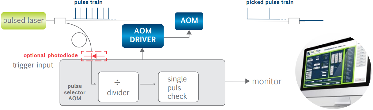 SmartPicker系列 AOM激光脉冲选择器是匹配声光调制器AOM选频的全软件控制脉冲选择器,是一种理想的、使用方便、稳定性和灵敏度高的信号发生器。这款脉冲选择器为声光调制器(声光偏转器)产生低抖动同步控制信号。