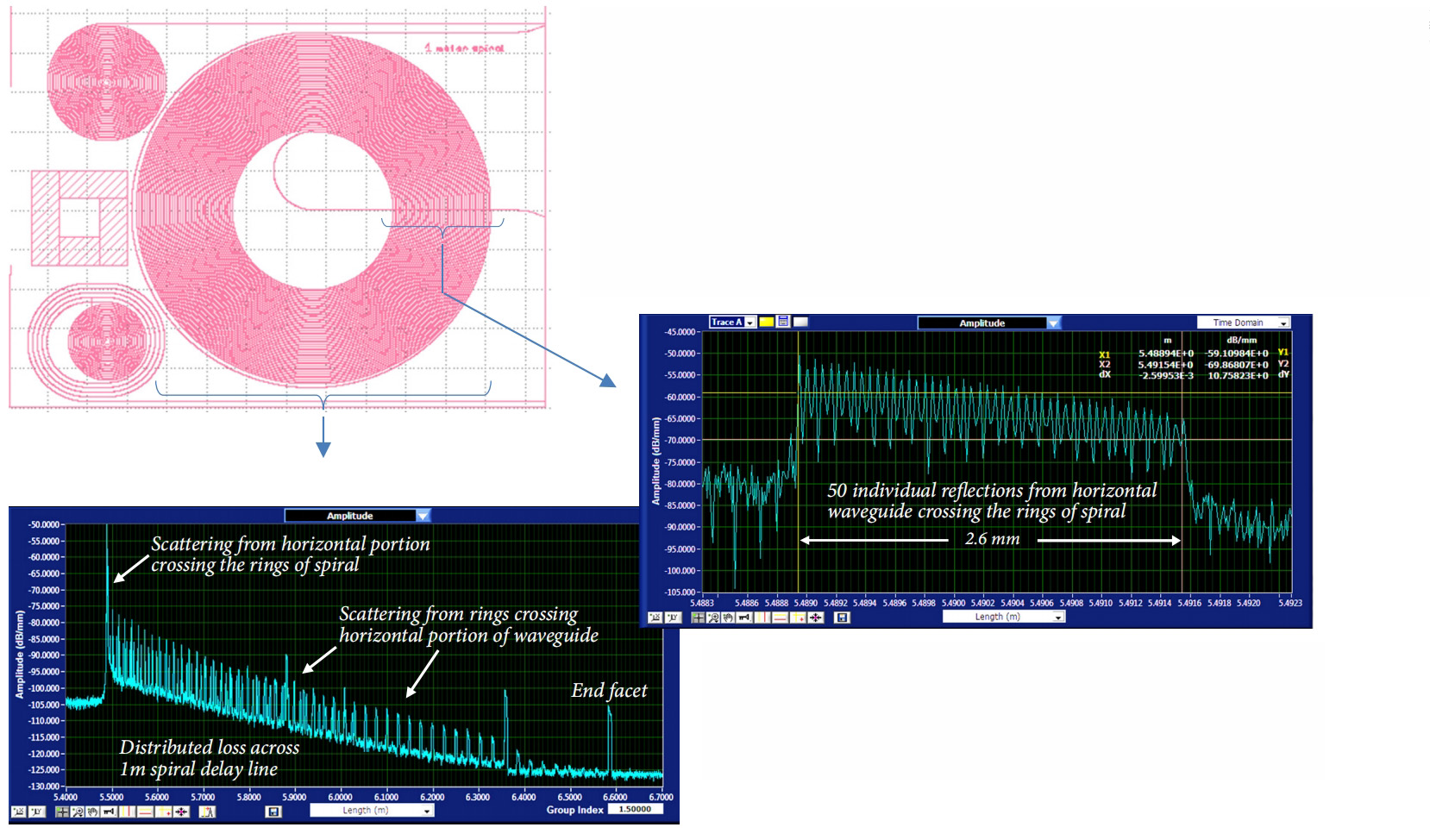 1米的螺旋波导显示在扫描波导中,与下面的螺旋环交叉。右图清楚地显示了一米螺旋上的分布损耗,包括水平波导交叉处的散射。