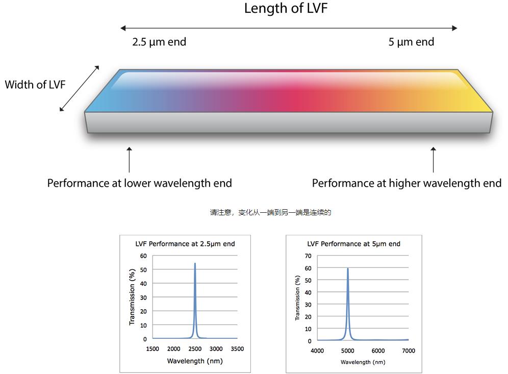Infrared Linear Variable Filters 红外线性渐变滤光片是窄带滤光片,其中心波长 (CWL) 随其长度方向的距离而变化,如下图所示为 2.5-5.0 µm 类型。请点击下面的链接查看我们的 LVF 系列,包括 2021 年推出的全新“第 2 代”LVF。