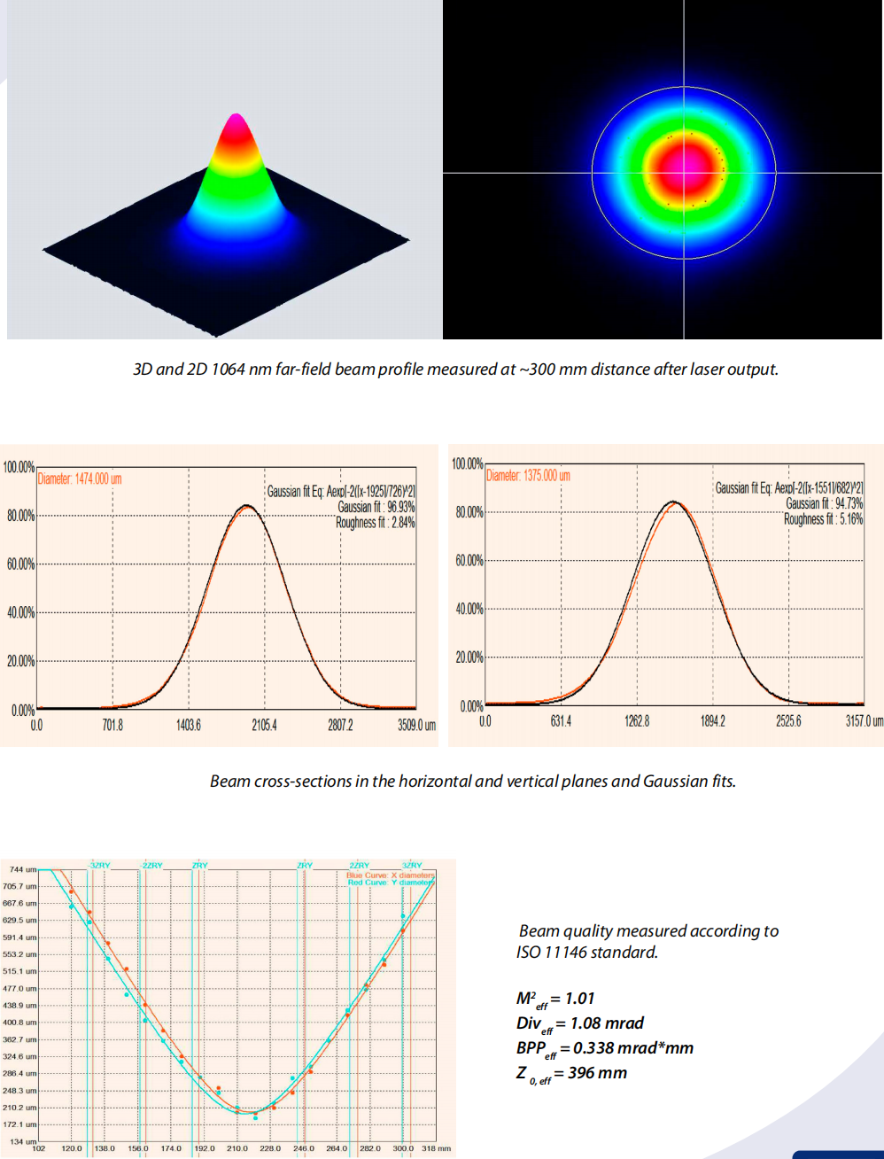 激光输出后在约 300 毫米距离处测量的 3D 和 2D 1064nm 远场光束轮廓。