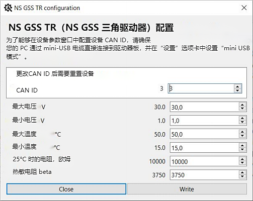 用户设置驱动器的 CAN ID、工作电压和温度的允许范围、25℃ 时的热敏电阻电阻值和 beta 参数。中间一列显示参数的当前值。要更改参数值,请在设置窗口中输入每个参数或通过上下箭头进行更改,然后单击“输入”以应用该值。