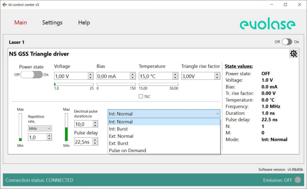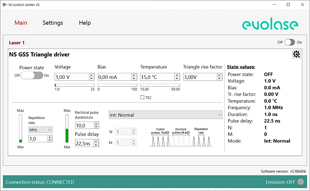 主面板右侧的“状态值”部分显示激光二极管相应参数的当前测量值。当控制窗口折叠时,状态栏中会显示相同的信息。斜线符号“/”前的数字显示在控制窗口中设置的值。斜线符号“/”后的数字显示从驱动器测得的实际值。电源状态切换开关也在状态栏的右侧重复。这允许用户在主窗口折叠时监控激光二极管的相应参数并打开和关闭其辐射。