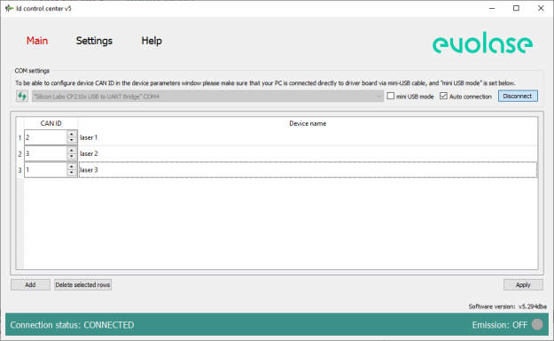 7. 该软件有很多用于连接和控制设备的通道。要连接新驱动器,请单击“添加”,在出现的行中输入驱动器的 CAN ID。您可以重命名驱动程序以便更好地跟踪它们。单击“应用”以应用系统配置。