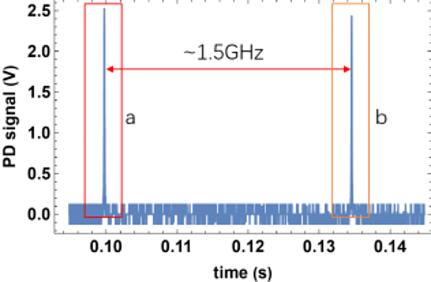 采用1654nm激光扫频时透射PD信号,注意此时没有进行仔细模式匹配,因此峰间隔1.5GHz左右