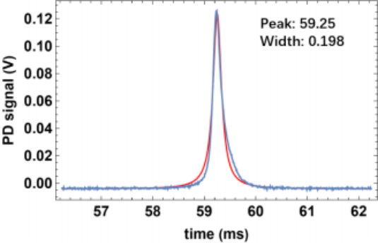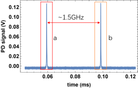 采用1063nm激光扫频时透射PD信号,注意此时没有进行仔细模式匹配,因此峰间隔1.5GHz左右。