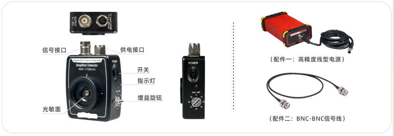 供电接口 | 供电开关 | 信号接口 | 增益调节 | 支杆接口 | 光学接口 | |||