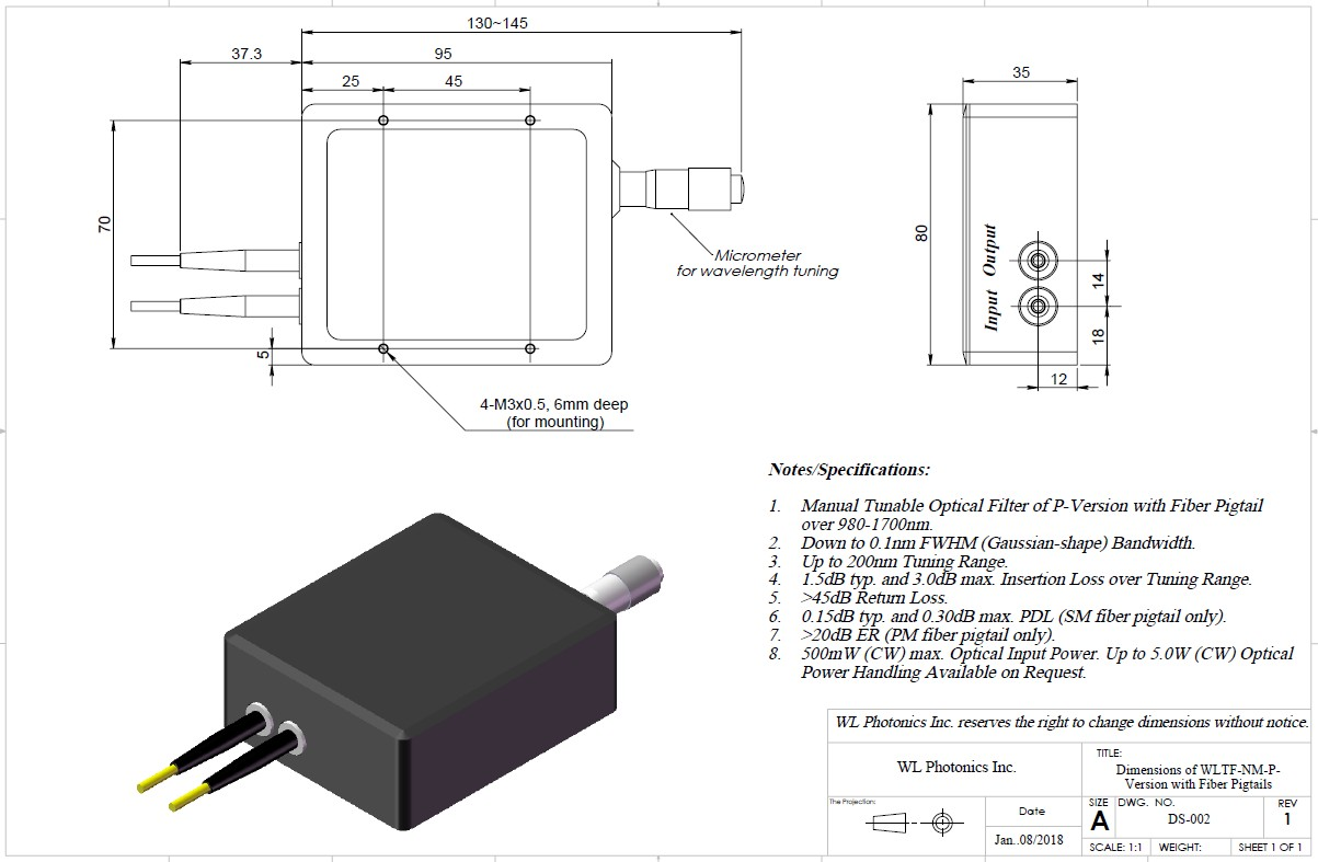 WLTFNM(或-NE)系列窄带可调谐滤光器是在自由空间光学的基础上,结合衍射光栅产生高斯形状的传输。它是一个2端口的光纤设备。当宽带频谱被注入到输入端口时,可调谐滤波器将选择一个目标频带进行输出,并拒绝频谱的其余频带。波长调谐由精密千分尺驱动器或通过USB接口连接到PC的微步进电机驱动,其中驱动由内置编码器监控并在闭环中动态控制。正在申请**的光学设计提供了带宽和调谐范围的好的选择,具有市场上所未有的低插入损耗和偏振相关损耗(PDL)。精确的调谐机制使滤波器能够提供高波长分辨率和出色的波长调谐重复性。手动和电动版本的过滤器都可用于X、O、S、C和L波段.