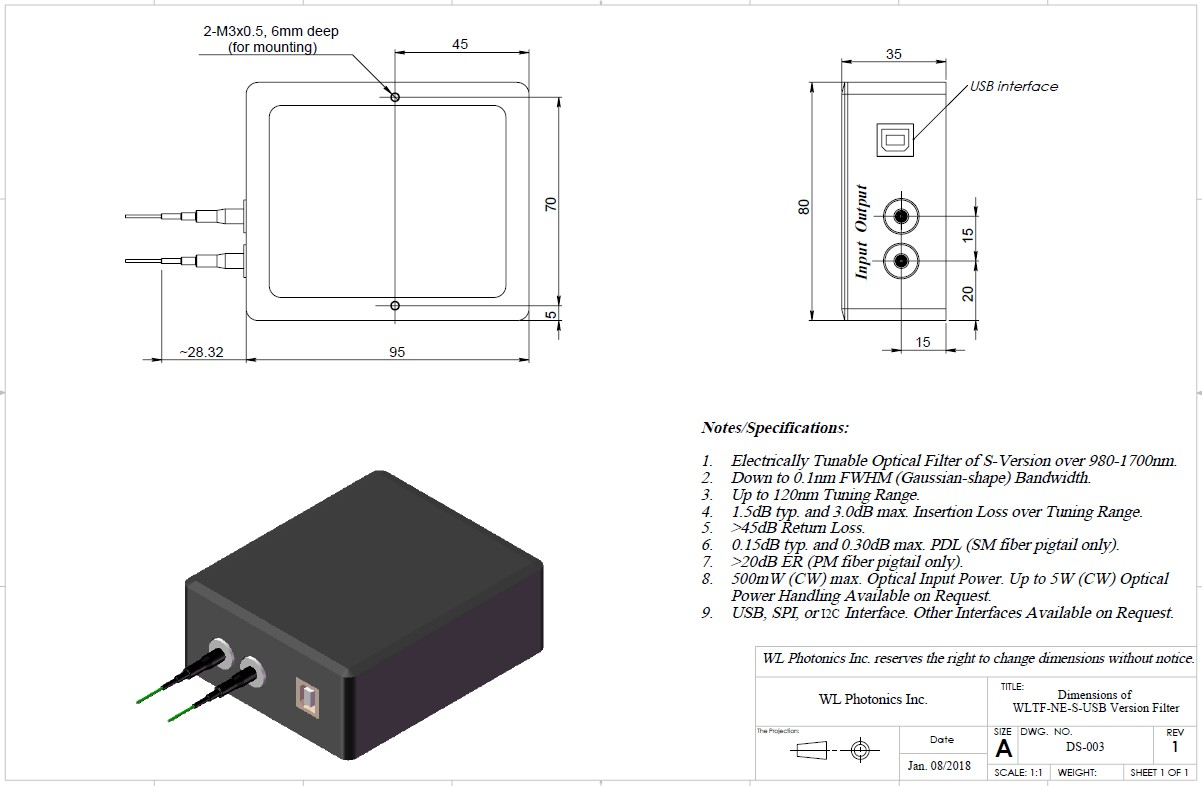 电动可调谐滤波器(WLTF-NE-S版本,带USB接口)的尺寸