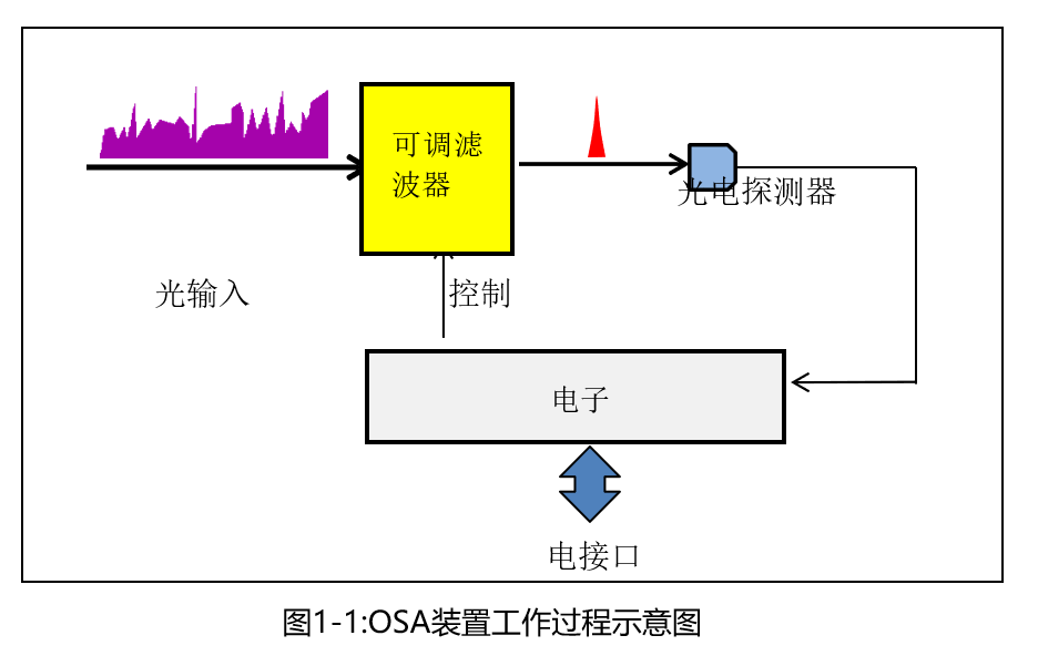GouMax的OSA光谱分析仪由带通可调滤光器、光电探测器和低噪声、高动态范围电子器件组成,如图1-1所示。当宽带光谱输入可调滤波器时,可调滤波器过滤出给定波长的窄带输入光。通过改变可调滤波器通带的中心波长,扫描整个输入光谱,并依次检测入射信号的光谱信息。光电探测器将通过滤光器的光转换成电流,然后将其数字化。数据处理单元分析数据,然后将频谱输出给客户。