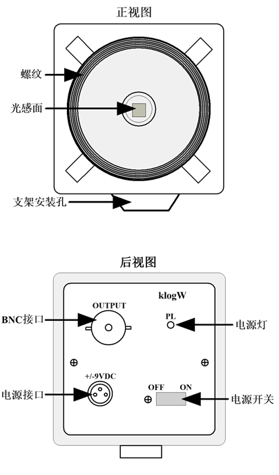 光电探测器是一种额定带宽,固定增益的光电探测器,用于检测光信号。光信号从光电sensor感应面输入,输出通过BNC以电压形式输出。本产品能测量800nm到1700nm波长范围的光信号。具体性能参数数据参考附录表格。LD-PD光电探测器外壳带有英制1/4"-20螺纹的安装孔,可以方便的安装固定。 外壳部分还附带两种不同尺寸的螺纹接圈,这两种螺纹接圈分别适合于工业应用和科研应用,可以方便适配外部光学部件,如滤光片,衰减片,镜头,FC光纤转接盘等。该产品包含一个塑料防尘盖。具体安装请参考阅读第三章节。 每个光电探测器都配有一个输出±9V的直流线性电源,该直流电源的输入额定电压为220VAC/50Hz。