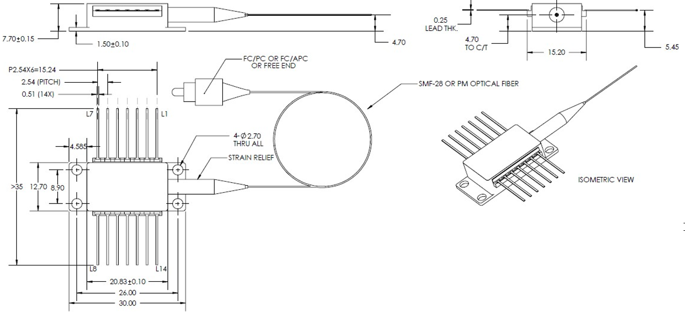 DenseLight DL-CS2079A系列是一种以固有的超辐射发光模式运行的宽带SLD.这种超辐射发光特性可以在更高的电流驱动下产生更宽的光谱带宽,而其他传统的基于ASE的SLED在更高的电流驱动下会产生更窄的光谱带宽。其低相干性降低了瑞利后向散射噪声。再加上高功率和大谱宽,它抵消了光接收器噪声,提高了空间分辨率(OCT)和测量灵敏度(传感器)。这款128nmSLED 是14引脚蝶形封装。它符合Bellcore文件GR-468-CORE的要求。