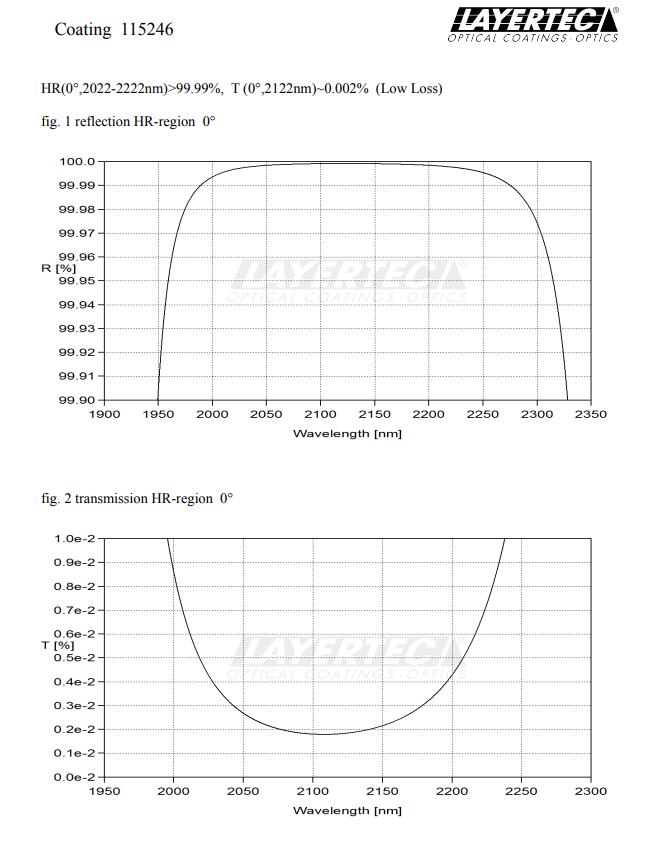 类别 高反射 High Reflectance 偏振 unpol. 入射角 0° 波长范围 2022 - 2222 nm 高反射 > 99.99 % | 类别 减反射 Anti-Reflectance 偏振 unpol. 入射角 0° 波长范围 2022 - 2222 nm AR / HT < 0.25 % |
