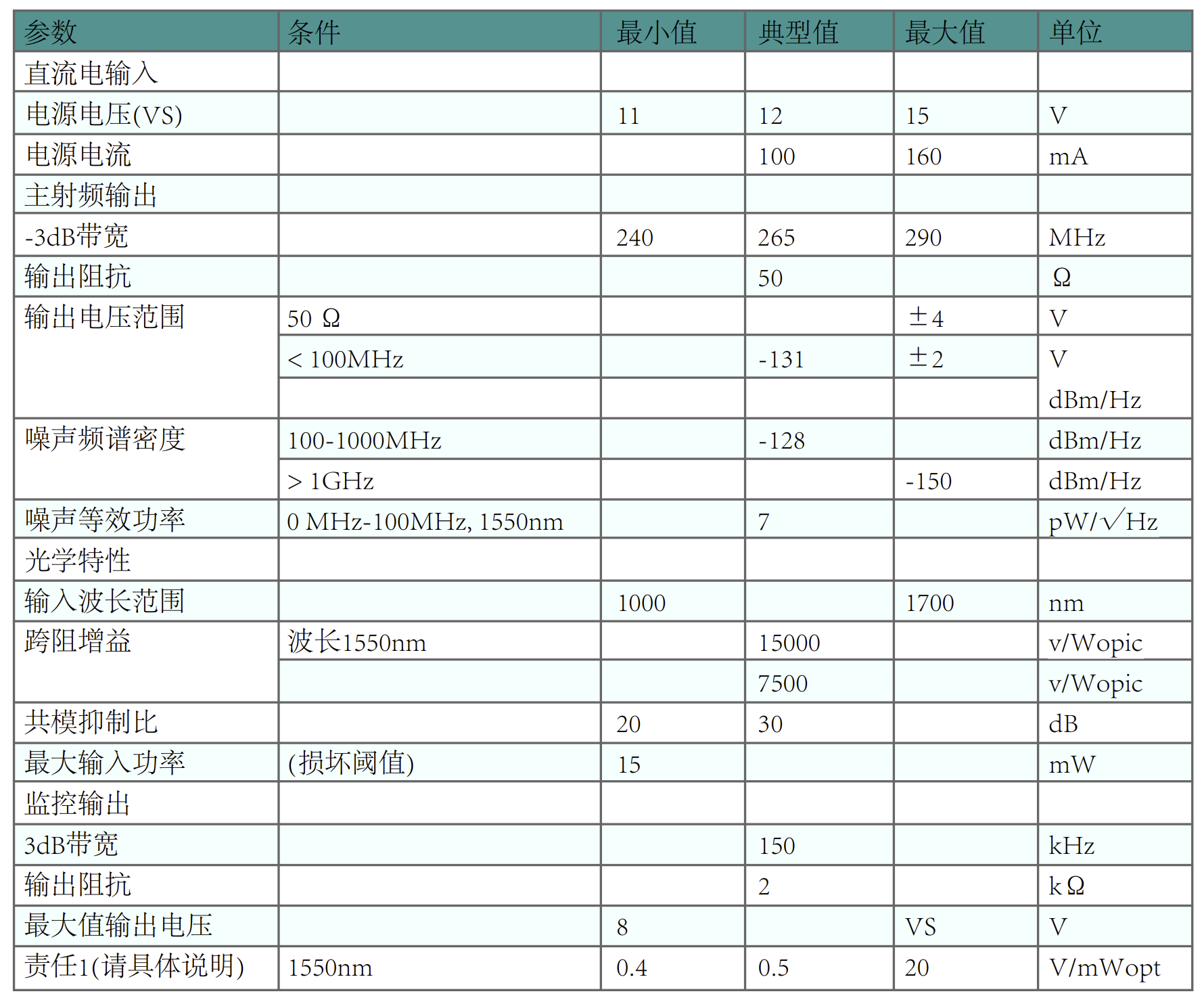 ● 环境噪声:20 pW/√ Hz (典型值)
