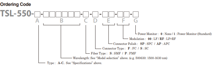 TSL-550 Type A 波长范围1355-1485nm; 输出功率>10mW 光纤类型 PMF 连接器类型:FC 连接器抛光截面APC 低频调制 电源监视器(标准)