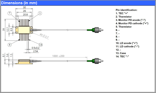 DFB-986-PM-30-PD-LT -> 30mW output power at 986nm peak wavelength, PM-980 fiber, with built-in monitor photodiode and fiber loose tube