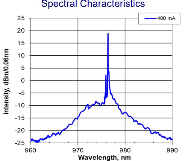 可用波长范围:990nm;输出功率: 150mW;工作电流:300mA ;正向电压:1.6V;阈值电流:70mA;光谱宽度at Pout@-3dB: 0.5nm;光纤类型:HI-1060