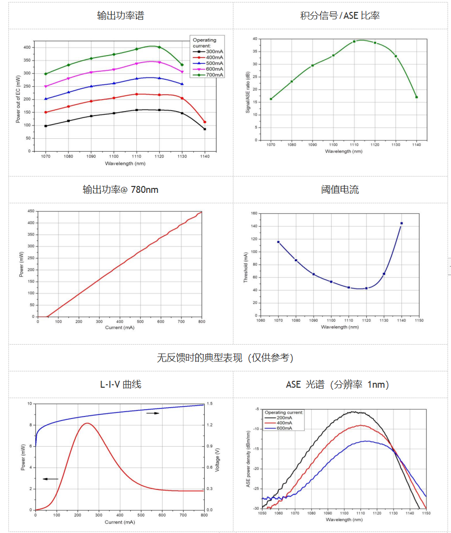 波长(最大功率处):1120nm; 中心波长:1105nm; 调谐范围:70nm; 最大输出功率:350mW; 正向电流:600mA; 慢轴光束发散角:4deg; 快轴光束发散角:35deg;