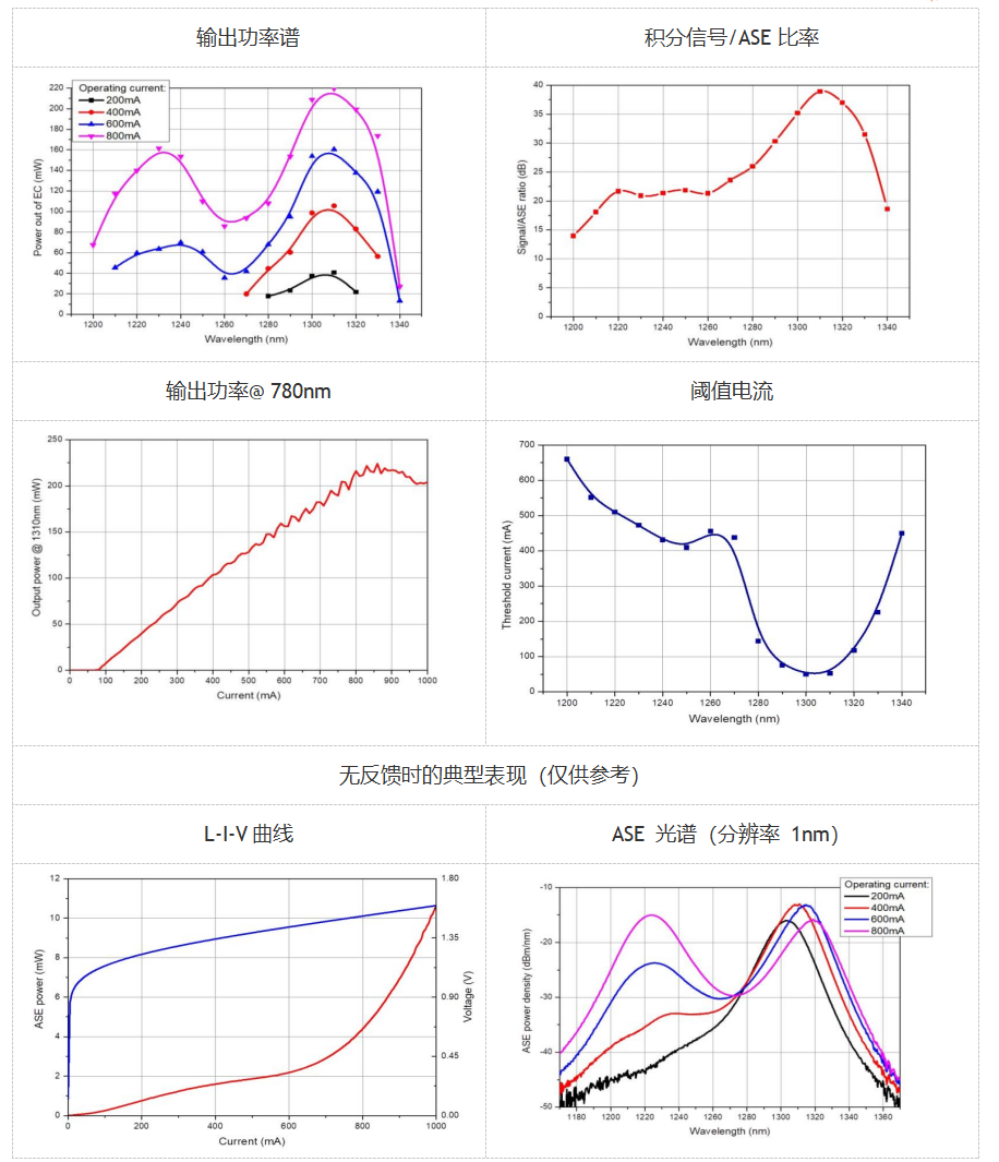 波长(最大功率处):1310nm; 中心波长:1270nm; 调谐范围:140nm; 最大输出功率:220mW; 正向电流:800mA; 慢轴光束发散角:5deg; 快轴光束发散角:38deg;