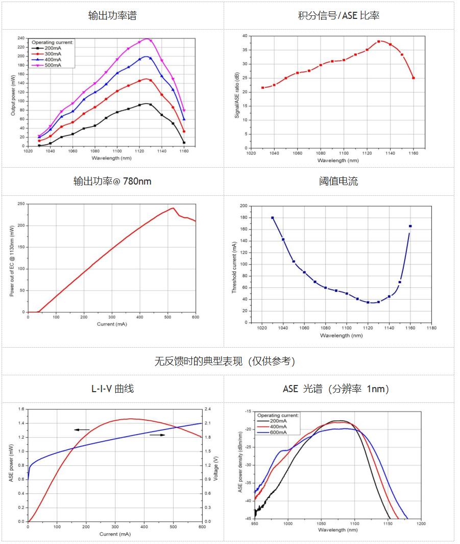 波长(最大功率处):1130nm; 中心波长:1105nm; 调谐范围:130nm; 最大输出功率:200mW; 正向电流:400mA; 慢轴光束发散角:9deg; 快轴光束发散角:38deg;