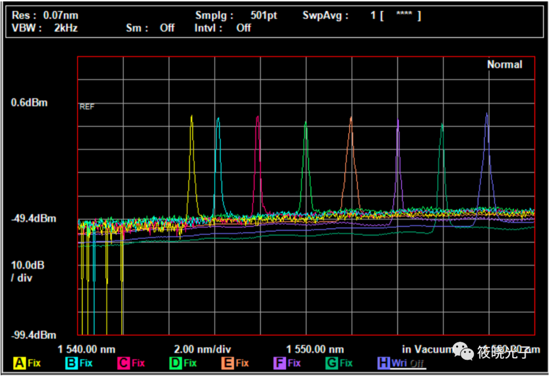 可调滤波器控制了谐振腔中不同频段的损耗强度,可选择性地让自发辐射光在目标频率点进行受激放大,生成激光。以本文的可调滤波器为例,其可调滤波范围为1545~1557 nm。扫描滤波器的滤波范围并采集激光输出光谱,得到不同波段的激光输出光谱图如下: