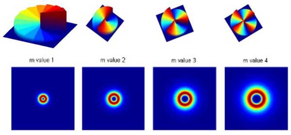 图7:上:1~4阶涡旋位相板的表面形貌(相延)示意图下:1 ~ 4阶涡旋位相板形成的远场强度分布图